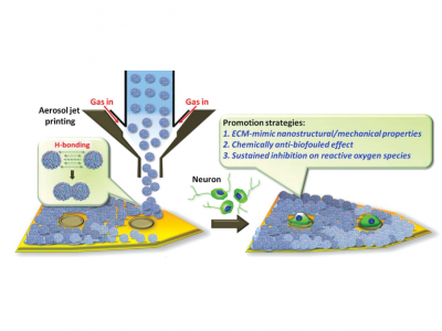 通過 Aeosol Jet 直接在神經(jīng)探針上打印 OPMSC 懸浮液形成圖案,創(chuàng)建抗炎神經(jīng)界面;OPMSC:以兩親性聚二甲基硅氧烷修飾的N,O-羧基殼聚糖(PMSC)與低聚原花青素(OPC)復(fù)合,研制了一種新型抗炎納米凝膠