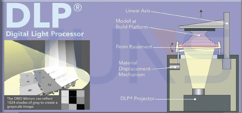 數(shù)字光投影:液體光聚合物或樹脂通過數(shù)字光源固化以構建部件。