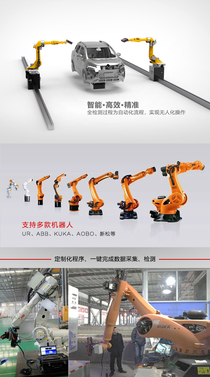 自動化三維掃描系統(tǒng) 該系統(tǒng)具備自主學(xué)習(xí)路徑掃描,人機協(xié)作,自主規(guī)劃掃描路徑,可定制2D、3D視覺識別,一鍵自動生成機器人程序。 自動化三維掃描系統(tǒng) 機器人三維智能引導(dǎo)系統(tǒng)(RTIG),作為自動化工業(yè)領(lǐng)域的應(yīng)用設(shè)備在今后將會發(fā)揮不可替代的作用。大到汽車產(chǎn)業(yè)的焊接作業(yè)、流水線的分類挑選,小到單個物件的識別抓取等。而三維掃描儀憑借其高速度,高質(zhì)量的數(shù)據(jù)采集能力,在工業(yè)、文化領(lǐng)域都有廣泛的使用,而兩者相結(jié)合是機器視覺領(lǐng)域一直在嘗試推進(jìn)的一項很實際的應(yīng)用。來高科技(天津)有限公司經(jīng)過多年的研究開發(fā),?將三維掃描儀與機器人結(jié)合,實現(xiàn)了全自動數(shù)據(jù)采集和空間任意位置信息的獲取和計算。 技術(shù)特點: 支持與機器人進(jìn)行多種方式交互通訊,可根據(jù)協(xié)議定制開發(fā)。 設(shè)備輕量級,根據(jù)機器人負(fù)載進(jìn)行定制。 掃描過程無需標(biāo)記點,全自動拼接。 全自動掃描,并可根據(jù)需求輸出數(shù)據(jù)。 可根據(jù)實時掃描結(jié)果修正機器人工作路線,實現(xiàn)在線編程。 根據(jù)掃描結(jié)果與數(shù)模比對,輸出比對誤差,進(jìn)行修正、加工?、打磨等。 可定制2D、3D視覺識別,一鍵自動生成機器人程序。 機器人智能3D數(shù)字化檢測系統(tǒng),將“一鍵式掃描”、“全尺寸檢測”、“人機協(xié)作”、“自動檢測報告”、“自主學(xué)習(xí)”等優(yōu)勢完美融合。配合高像素、快速掃描的產(chǎn)品性能優(yōu)勢,可以快速獲取三維數(shù)據(jù)。該系統(tǒng)具備自主學(xué)習(xí)路徑掃描,人機協(xié)作,自主規(guī)劃掃描路徑,可定制2D、3D視覺識別,一鍵自動生成機器人程序。? 技術(shù)特點: ? ? ??? 掃描過程無需標(biāo)記點,全自動拼接。 ? ? ????全自動掃描,并可根據(jù)需求輸出數(shù)據(jù)。 ? ? ????根據(jù)掃描結(jié)果與數(shù)模比對,輸出比對誤差。 ? ? ????可定制2D、3D視覺識別,一鍵自動生成機器人程序。 ? ? ????應(yīng)用于工業(yè)自動化流水線的快速檢測。 更多詳情請點擊——自動化三維掃描系統(tǒng) 上一頁 下一頁